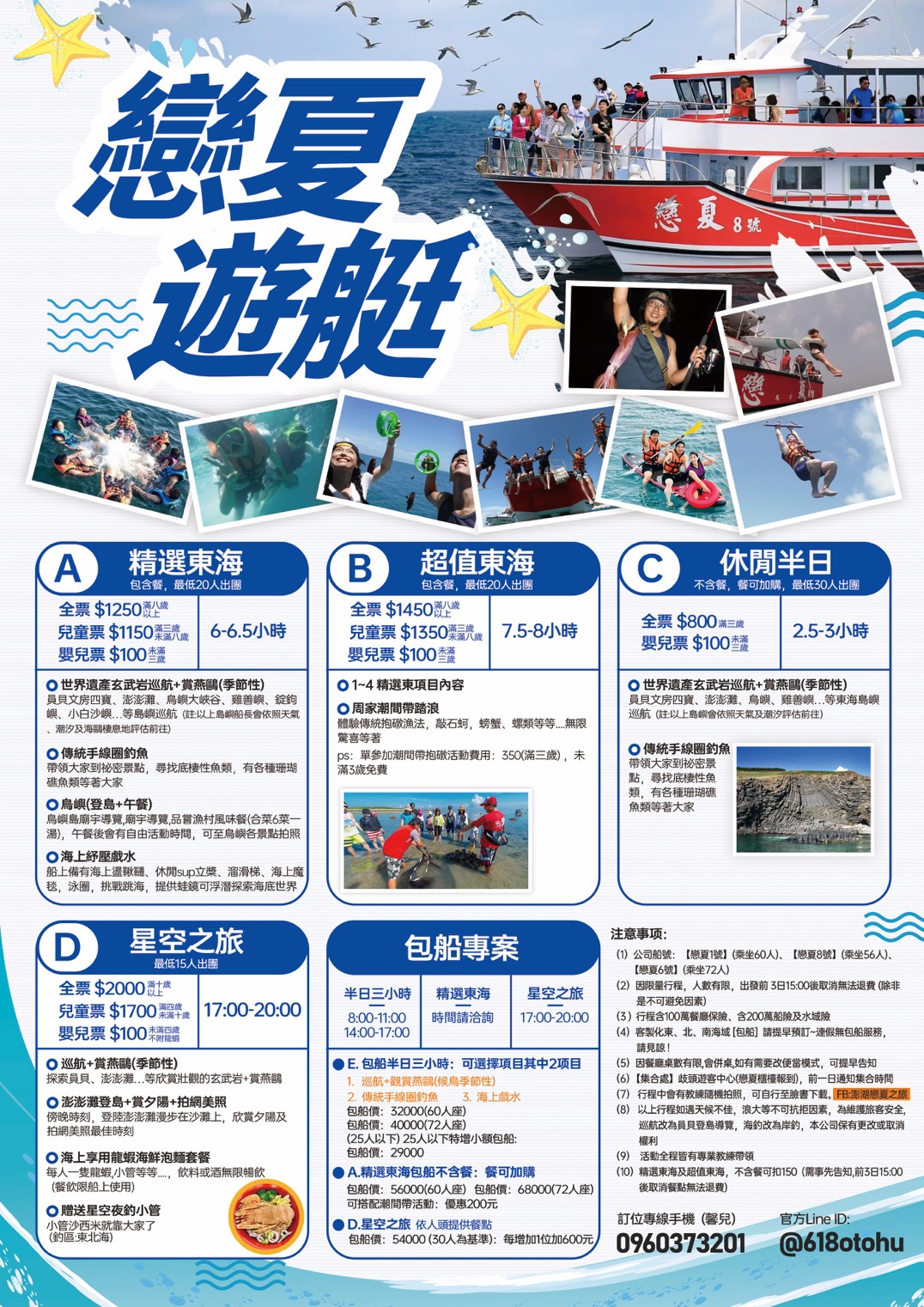 C. 東海半日遊(不含餐): 1.世界遺產玄武岩巡航+賞燕鷗(季節性):東海島嶼巡航(註:島嶼船長會依依照天氣及潮汐及海鷗棲息地評估前往)。 2.傳統手線圈釣魚 全票(滿3歲以上):600/人 嬰兒票(3歲以下):100/人 ※活動時間約2.5-3小時,行程配合潮汐,出發前一日通知開船時間 |