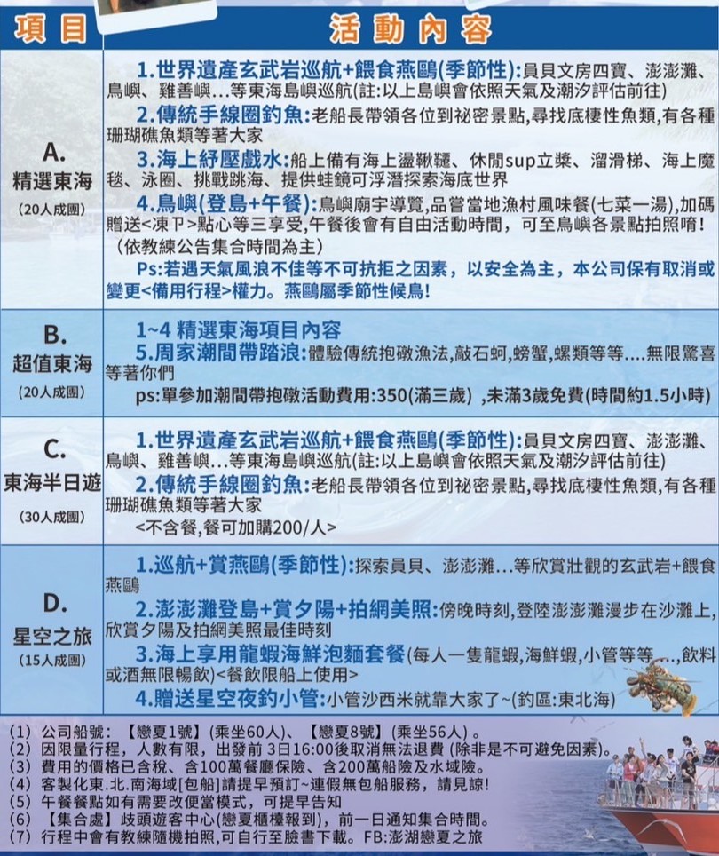 A.精選東海:約6-6.5小時 B.超值東海:約8小時 C.東海半日遊:約2.5-3小時 以上行程配合潮汐,出發前一日通知開船時間 D.星空之旅:17:00開船 20:00結束 約3小時 |
