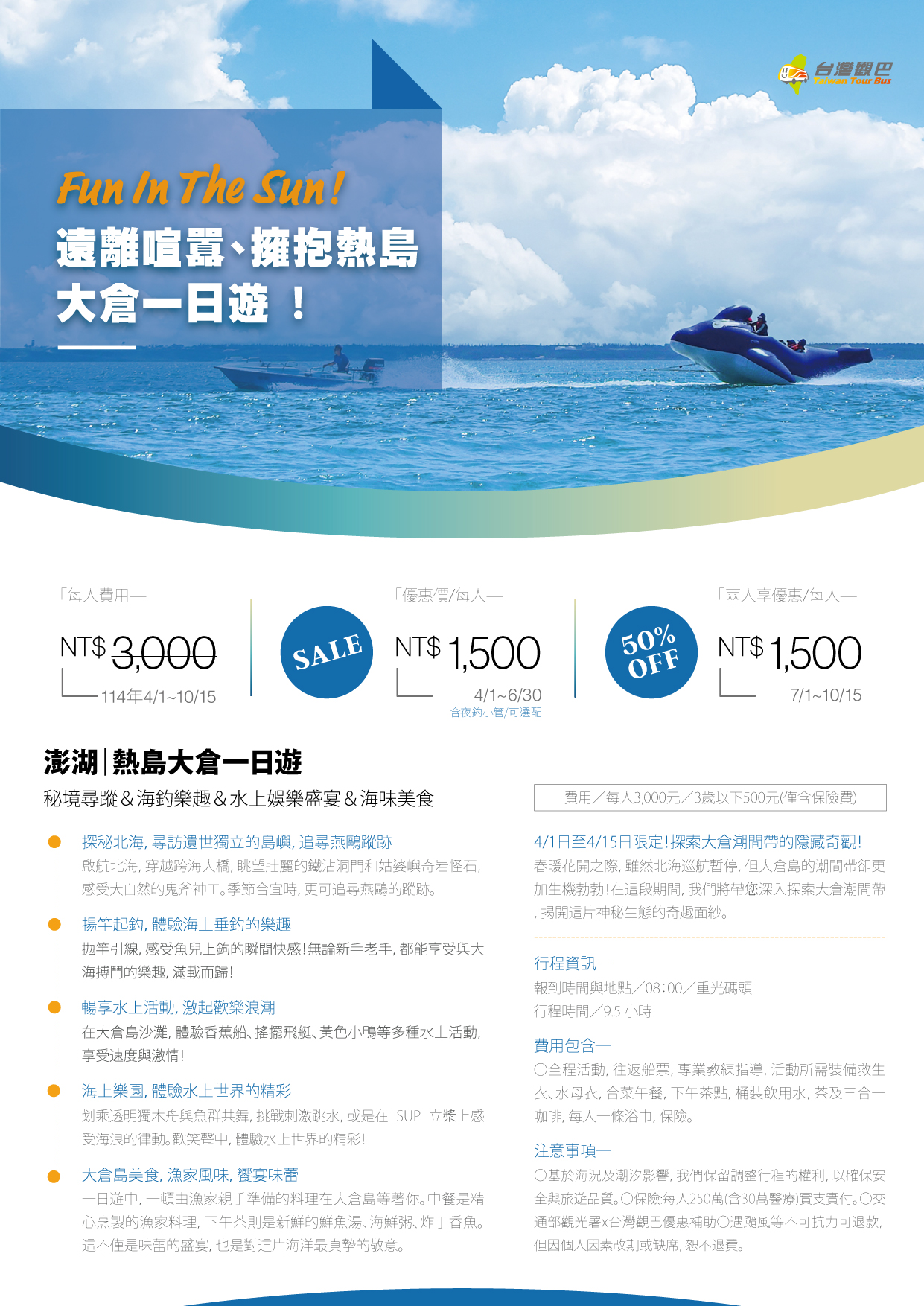 2025補助優惠方案: 一日遊(不含夜釣小管)費用:900/人(4/1-6/30) 一日遊(含夜釣小管)每人費用:1500/人(4/1-6/30) 買一送一優惠:平均1500/人(7/1-10/15) 費用包含下列 1.大倉島及活動船資及活動所需裝備 2.中式午餐 3.丁香魚下午茶 4.保險250萬含20萬醫療 5.休閒漁業或北海巡航(依季節調整) 6.內海海釣 7.水上活動四合一 8.内海戲水(透明獨木舟、SUP、跳水or 漁業) 9.飲用水,茶包、三合一咖啡<提供重複性咖啡杯> 10.華語導覽解說。 備註: 1.行程時間:約9.5小時 2.請攜帶具照片與身分證明文件之有效證件(身分證、駕照、健保卡),供查驗身份,未經報名 者,不得搭乘亦無退費。 |