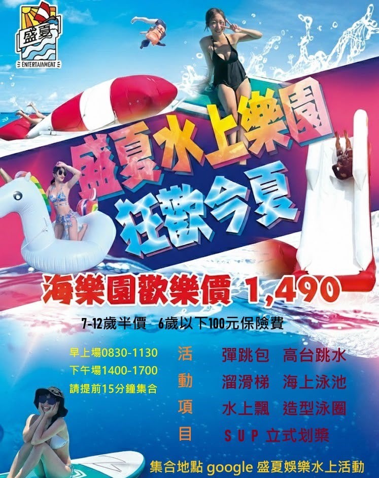 上午場 08:30-11:30 下午場 14:00-17:00 活動設施: 海上彈跳包.高台跳水.溜滑梯.海上泳池.輕功水上漂.SUP立式划槳.造型泳圈.時間內不限次數體驗 |
