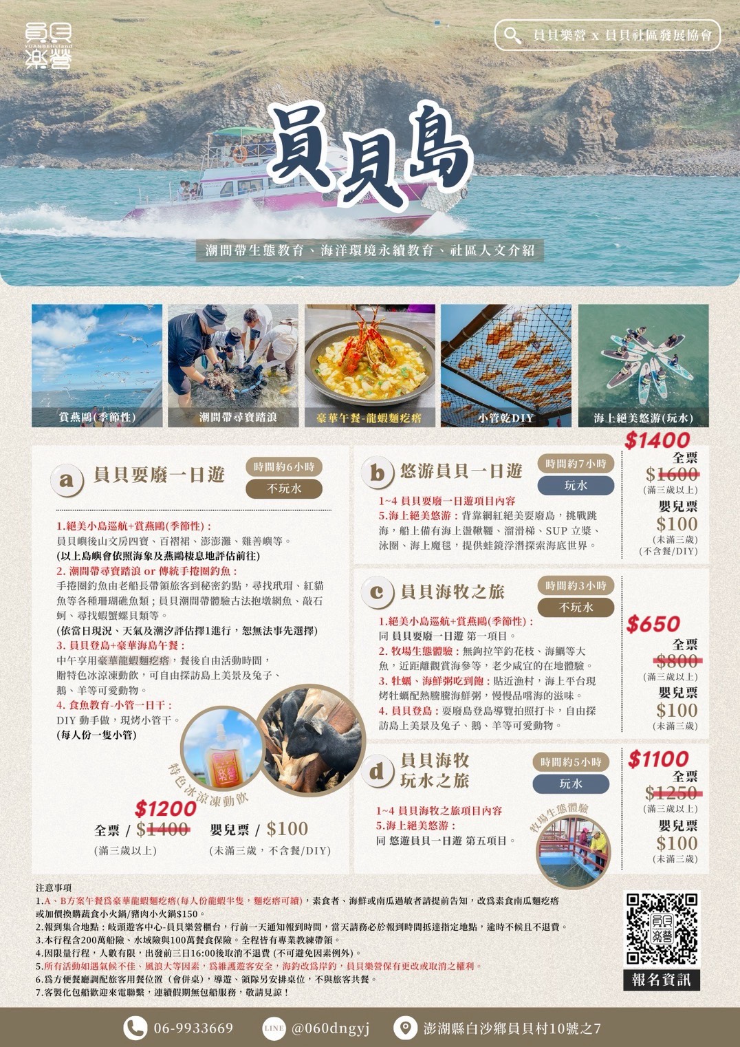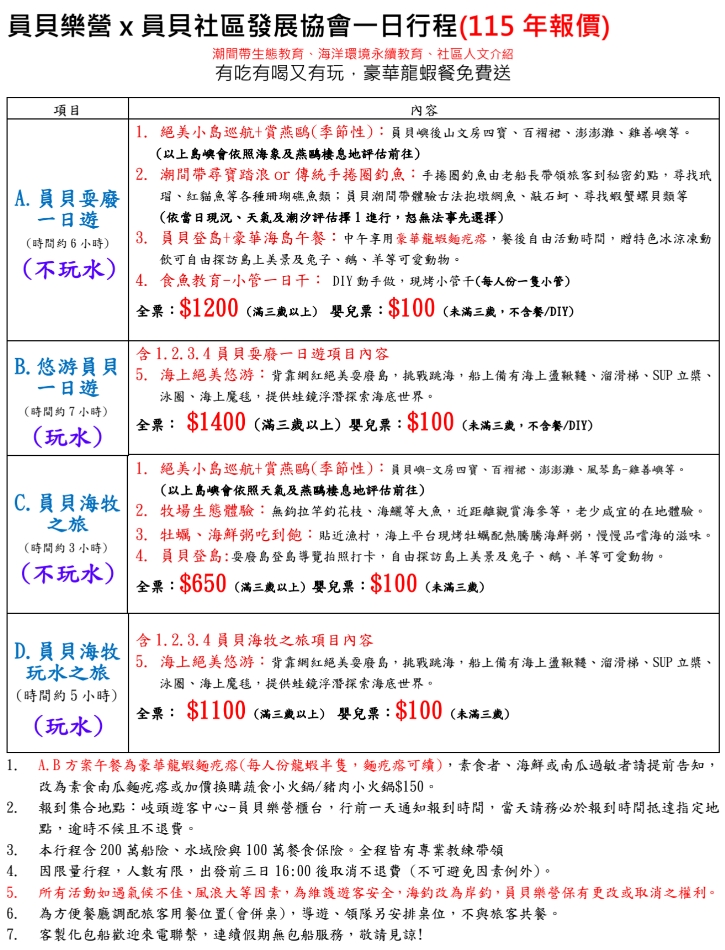 4/1開始(A.C方案)正式出團,考量月初水溫較低天氣不穩定因素,影響旅客活動體驗,水上活動(B.D方案)及海上餐廳遊程將於4/20開始進行,不便之處,敬請見諒