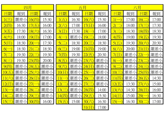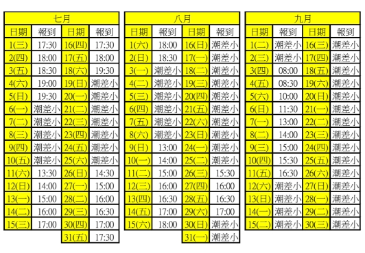 A. 潮間帶生態探索(4月~9 月) 1.行前講解介紹。 2.潮間帶生物認識、生態解說。(不抓取任何海洋生物料理食用) 全票(滿3歲以上):500/人 嬰兒票(3歲以下):100/人 ※配合潮汐,活動時間如下表所示。 *活動時間約 1.5 小時左右。 (4 人以上成行) |