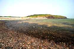 北寮半島的奎壁山是一處典型的陸連島,與對面的赤嶼距離約五百公尺,退潮時如摩西開海,裸露出大片的潮間帶及玄武岩礫石的踏浪步道,遊客下海踏浪之際,別忘了先查查潮汐表,以免沒算準時間下海,突然漲潮後不只壞了興緻,還會發生危險。
