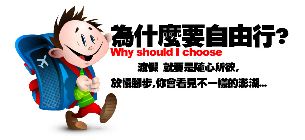 跟團是不可能有時間讓你精挑細選你想要吃的,跟團不可能等你擺好POSE水水的拍個照,跟團也不可能讓你悠閒慢活的欣賞澎湖美麗的沙灘及夕陽,跟團更不可能帶你去深入的探索澎湖在地民俗和建築之美,跟團還是不可能有時間讓你舒服暢快的浸泡著澎湖潔淨清涼的海水,跟團依然不可能讓你悠閒輕鬆的享用美味早餐,跟團絕對不可能讓你在難得擁有的假期裡躺臥在舒適的床上睡到自然醒,所以... ... 不用說跟團一定不可能讓你有時間慢慢體會及發現澎湖的人文風情、特殊的建築藝術、特別的動植物及澎湖特有餐飲文化和澎湖引以為傲的天然資源。