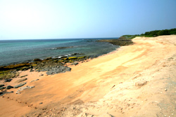 北寮半島的奎壁山是一處典型的陸連島,與對面的赤嶼距離約五百公尺,退潮時如摩西開海,裸露出大片的潮間帶及玄武岩礫石的踏浪步道,遊客下海踏浪之際,別忘了先查查潮汐表,以免沒算準時間下海,突然漲潮後不只壞了興緻,還會發生危險。